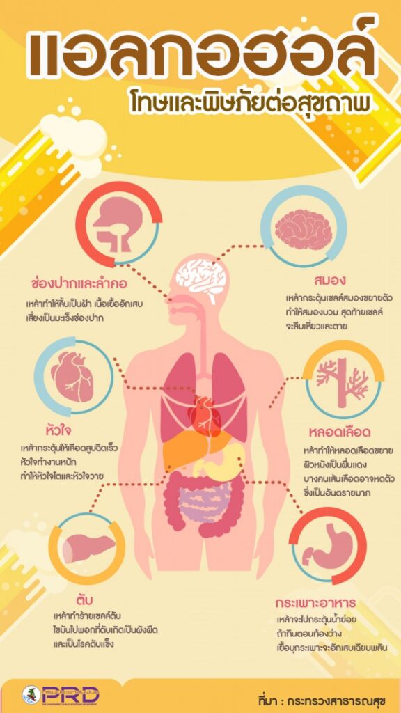 – พิษเฉียบพลัน (Alcohol poisoning) : หากดื่มมากเกินไป อาจหมดสติ หายใจช้าลง ความดันโลหิตต่ำ และถึงขั้นเสียชีวิตได้